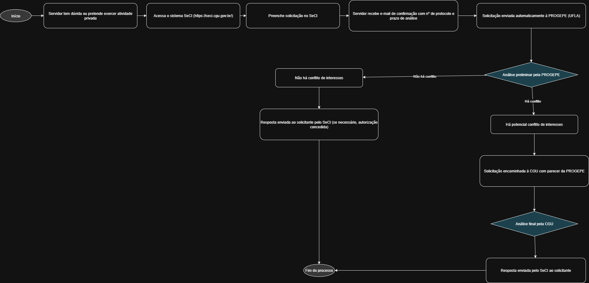 Concluída a análise preliminar da PROGEPE, caso esta entenda pela não existência do conflito de interesses, será enviada, por meio do SeCI, a resposta para o solicitante informando-o desse fato. Em caso de pedido de autorização, será disponibilizada no sistema uma cópia de documento que autoriza o agente a exercer a atividade pretendida.